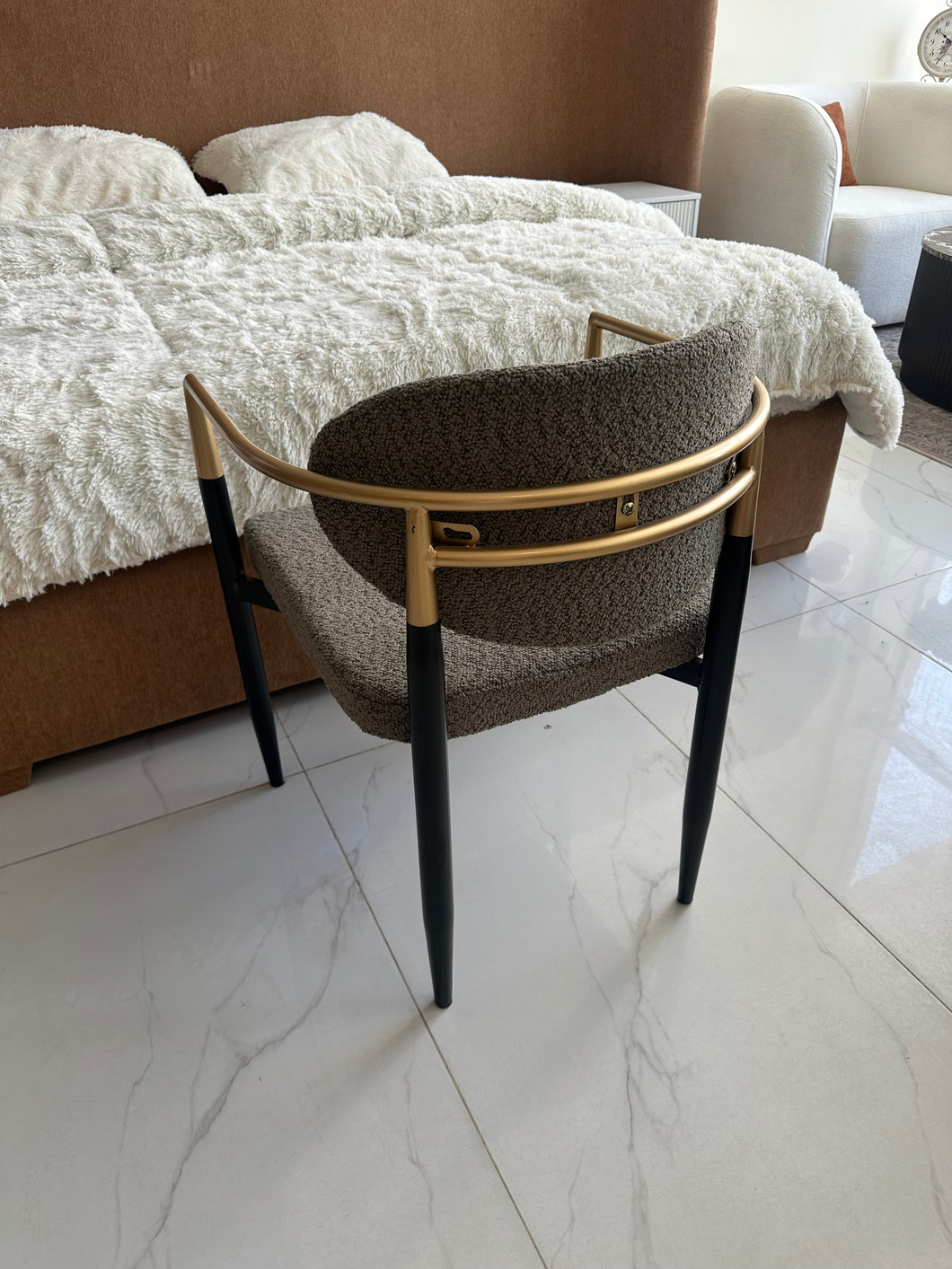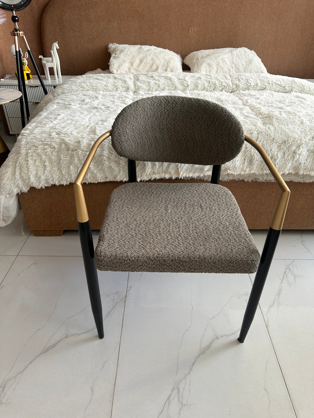 Made of solid wood, metal legs, padded with foam and fabric