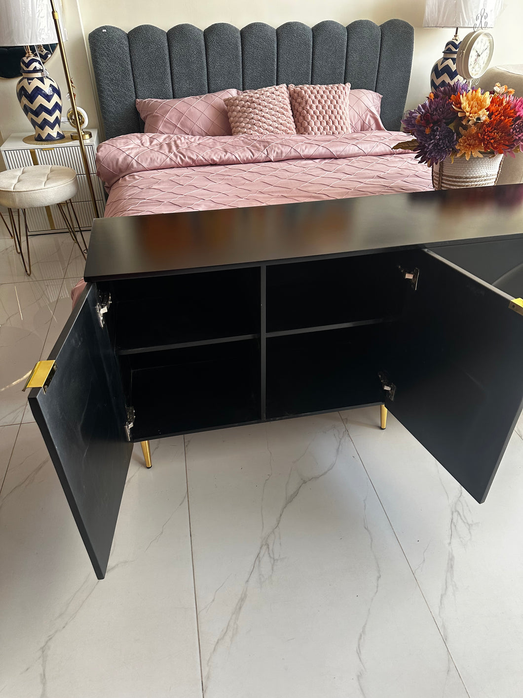 Off White Console with CNC design on front.